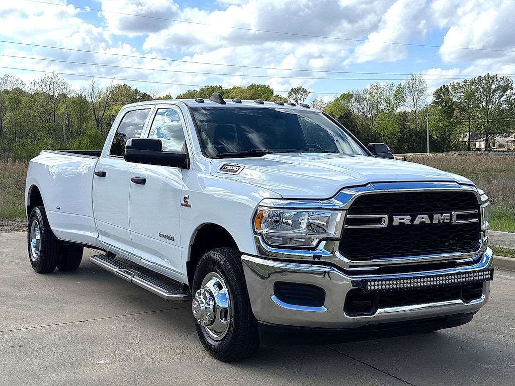 Introducing the 2022 Ram 3500 Tradesman Crew Cab 4x2, a powerhouse designed to meet the rigorous demands of both work and leisure. With its striking bright white clearcoat exterior, this truck not only commands attention but also offers unparalleled durability and reliability. The spacious black interior is thoughtfully designed for comfort and functionality, ensuring a pleasant driving experience for both the driver and passengers. Powered by a formidable Cummins high output 6.7L I-6 diesel engine, this Ram 3500 delivers an impressive 420 horsepower, making it a leader in towing capacity and performance. The intercooled turbo and VVT direct injection technology work in harmony to provide robust power and efficiency for all your heavy-duty needs. Featuring a generous 8-foot box, the Tradesman is equipped to handle any cargo, whether for work or weekend adventures. With a focus on practicality, this truck is engineered to ensure you tackle any task with ease. Elevate your driving experience with the 2022 Ram 3500 Tradesman-where strength meets style and capability.
